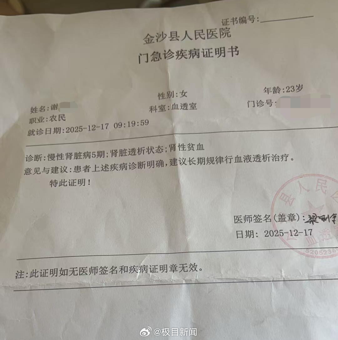 根据小鱼提供的诊断证明,她的病情为慢性肾脏病5期、肾脏透析状态、肾脏贫血,医生建议长期规律行血液透析治疗。金沙县人民医院相关科室工作人员也向极目新闻记者证实,小鱼每周会来医院做3次透析,透析费用确实无需个人承担,但部分药物费用需要自理。(极目新闻记者 柳之萌)