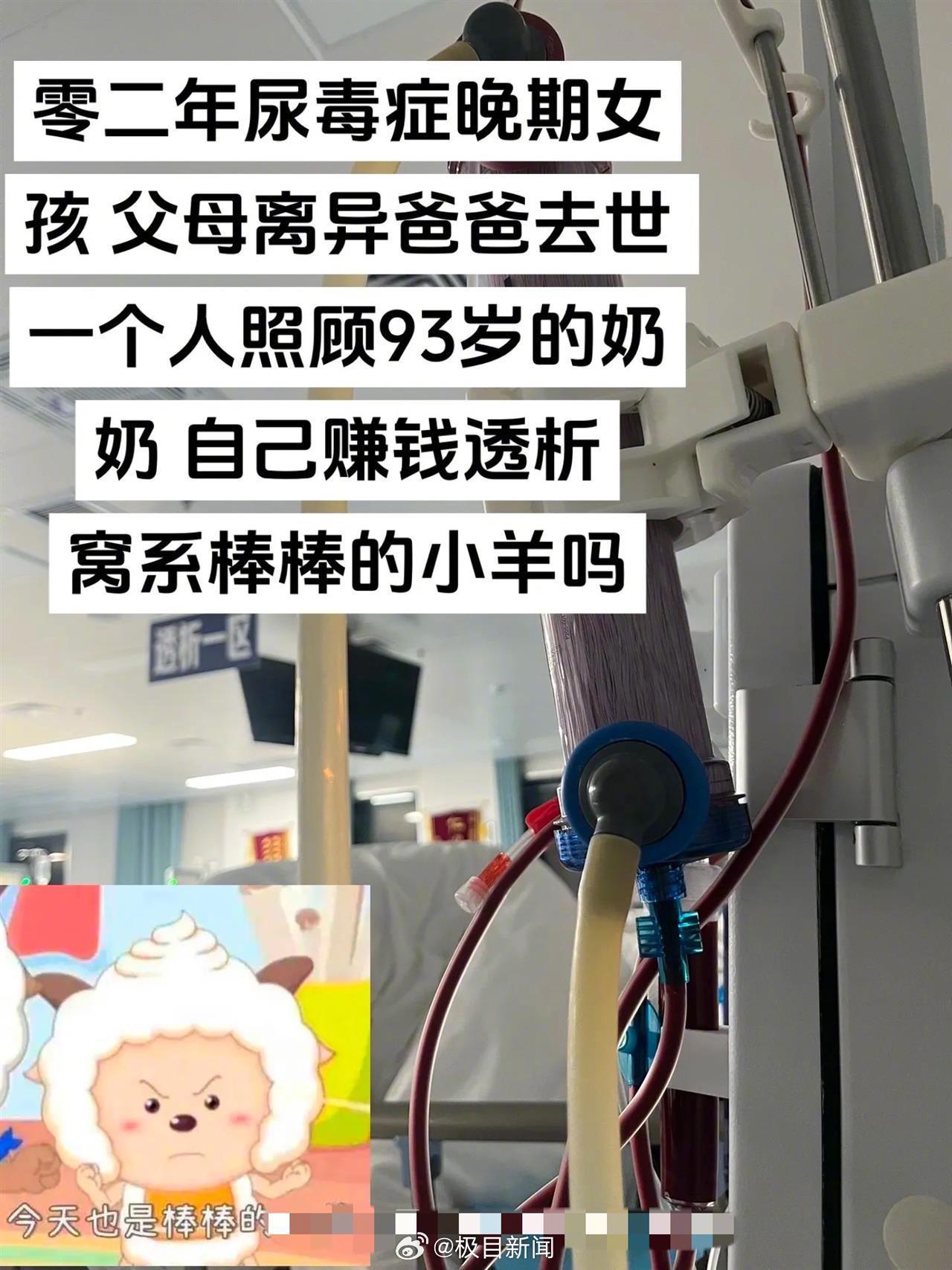 近日,贵州23岁的博主“努力的小鱼”发布的求助视频受到广泛关注。视频里,她分享了自己确诊尿毒症晚期的困境,3岁时母亲离家,父亲也已去世,如今仅与93岁的奶奶相依为命。她的视频记录了在医院透析治疗的场景,也有奶奶出镜跳舞的画面,其中点赞最高的视频已超过百万,众多网友留言为她加油打气。